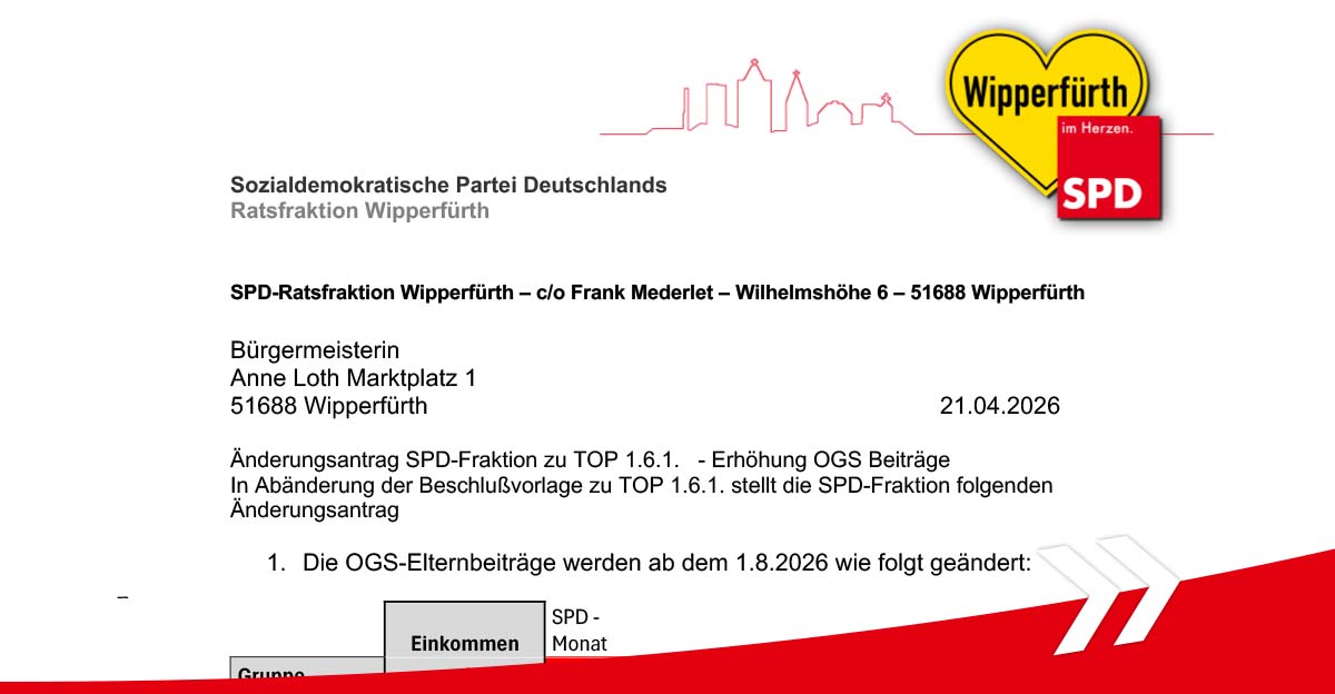 Im Anhang der „Änderungsantrag SPD-Fraktion zu TOP 1.6.1. – Erhöhung OGS Beiträge“.
