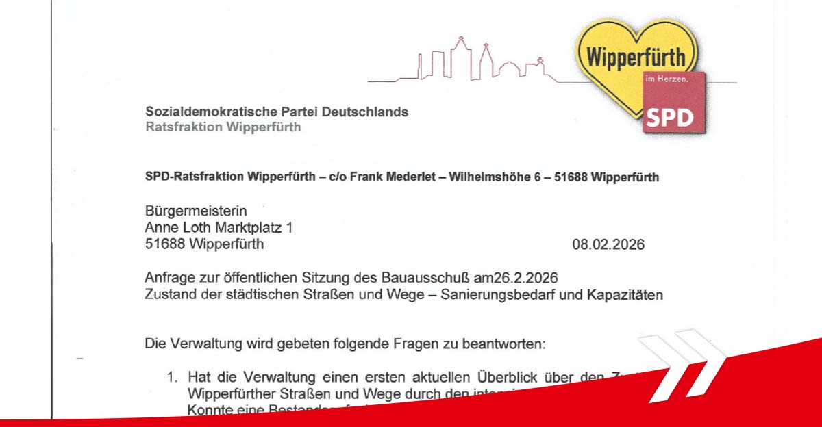 Im Anhang die „Anfrage zur öffentlichen Sitzung des Bauausschuß am 26.2.2026 Zustand der städtischen Straßen und Wege – Sanierungsbedarf und Kapazitäten“.